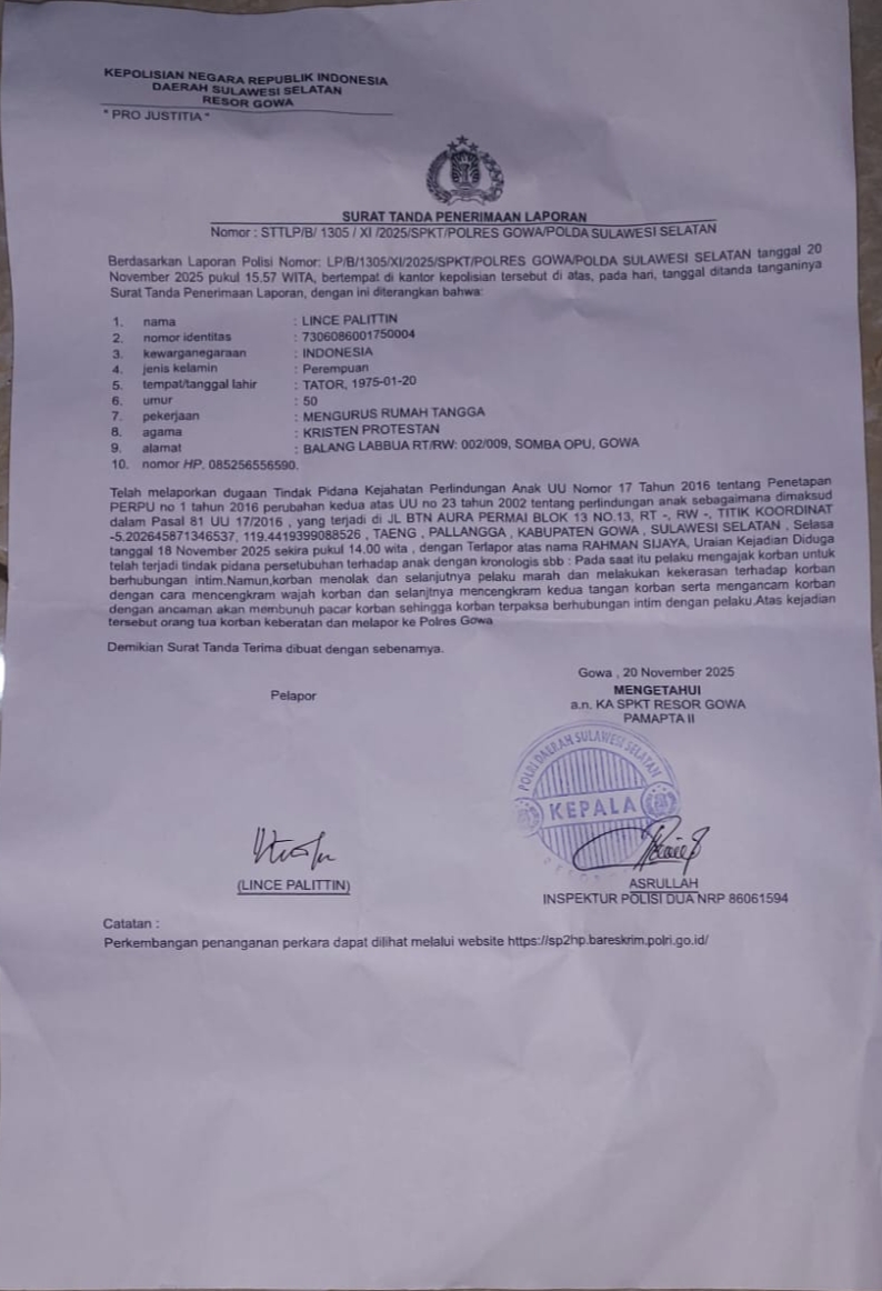 GARDATIMURNEWS.COM |Gowa – Satuan Reserse Kriminal Polres Gowa tengah melakukan penyidikan terkait laporan dugaan persetubuhan terhadap anak di bawah umur yang diduga melibatkan seorang direktur perusahaan berinisial R. Laporan tersebut dibuat oleh keluarga korban berinisial L (15 tahun).