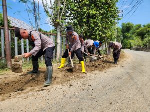 Dengan menggunakan peralatan manual seperti sekop, cangkul, dan gerobak dorong, personel Polres Pidie bergotong royong membersihkan sisa lumpur agar akses jalan kembali bersih, aman, dan nyaman dilalui masyarakat.