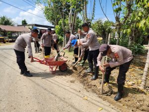 Personel Polres Pidie melaksanakan kegiatan pembersihan jalan di Gampong Beureueh II, Kecamatan Mutiara Timur, Kabupaten Pidie.