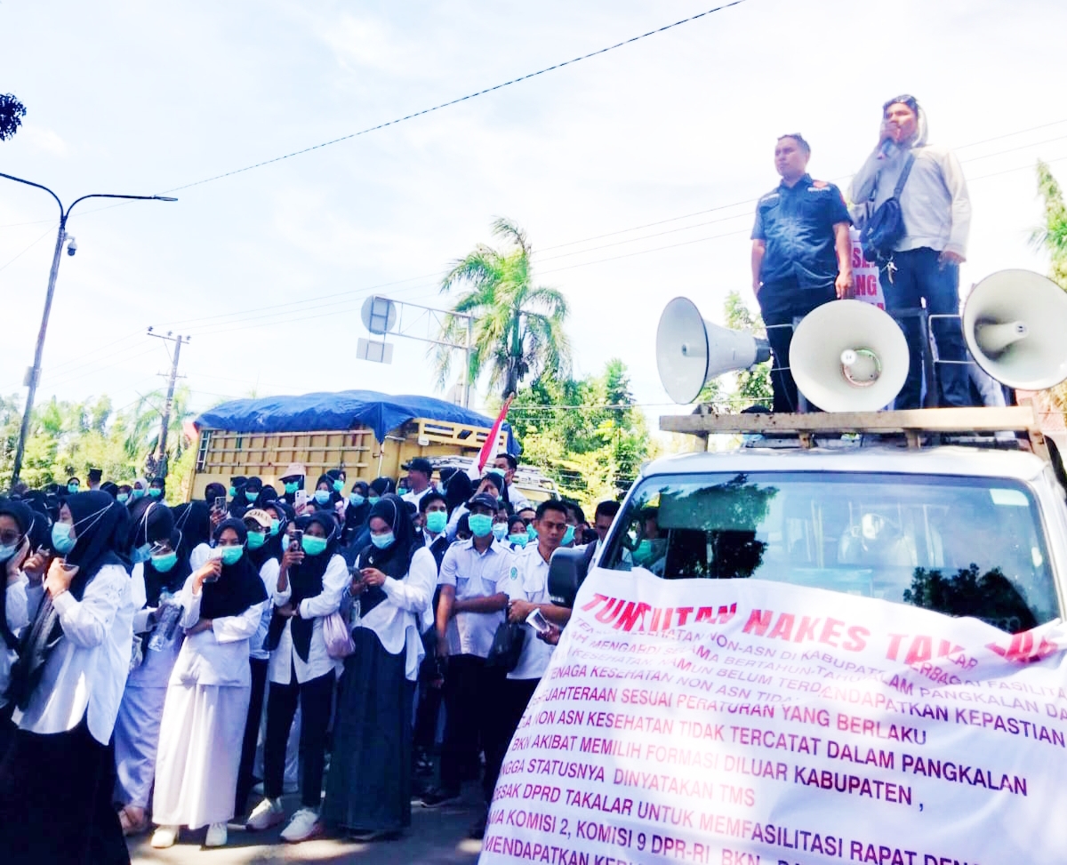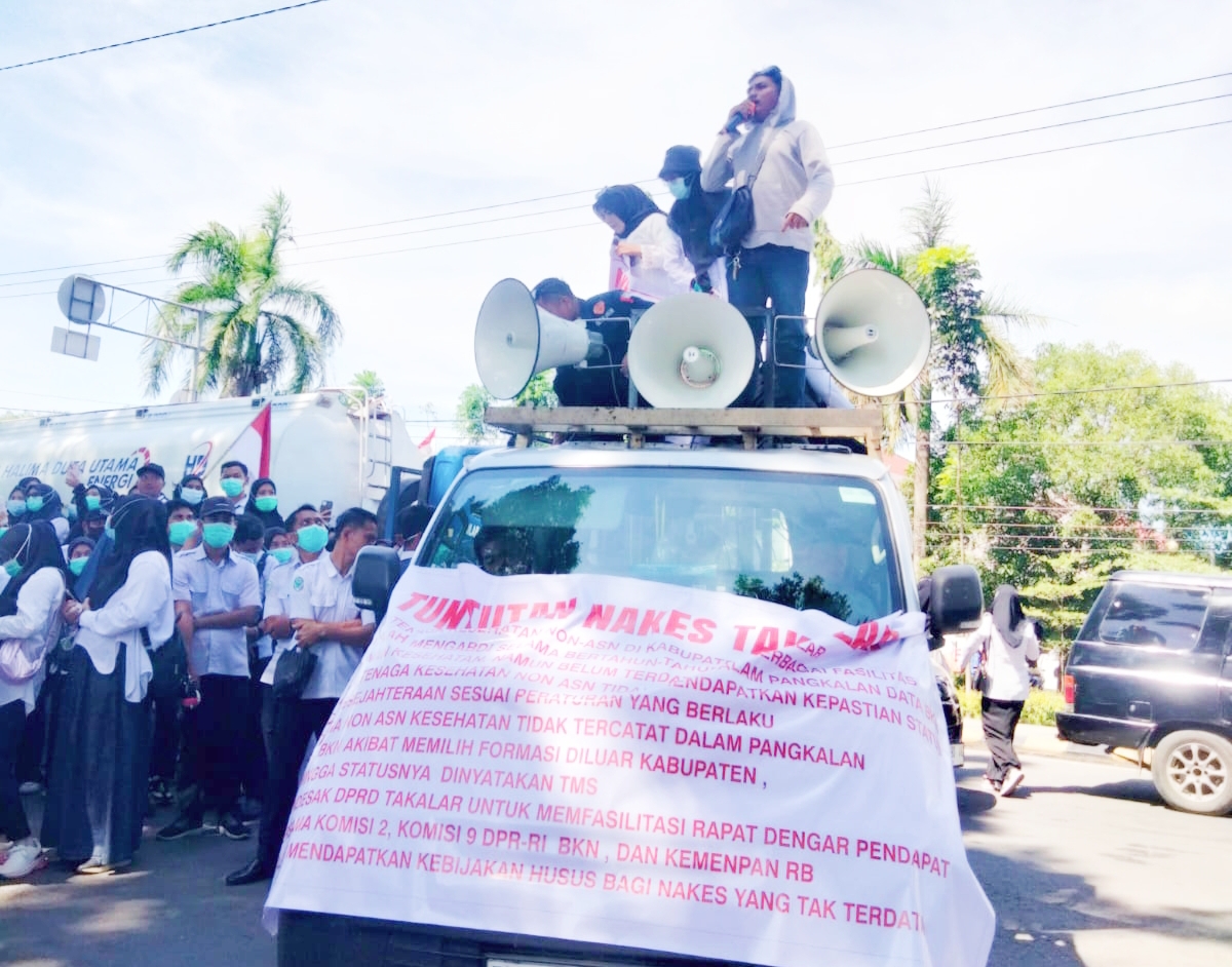 “Selama ini kami bekerja penuh waktu untuk melayani masyarakat, namun status kami seolah tak diakui oleh negara,” ujar salah seorang perwakilan nakes dalam orasinya.