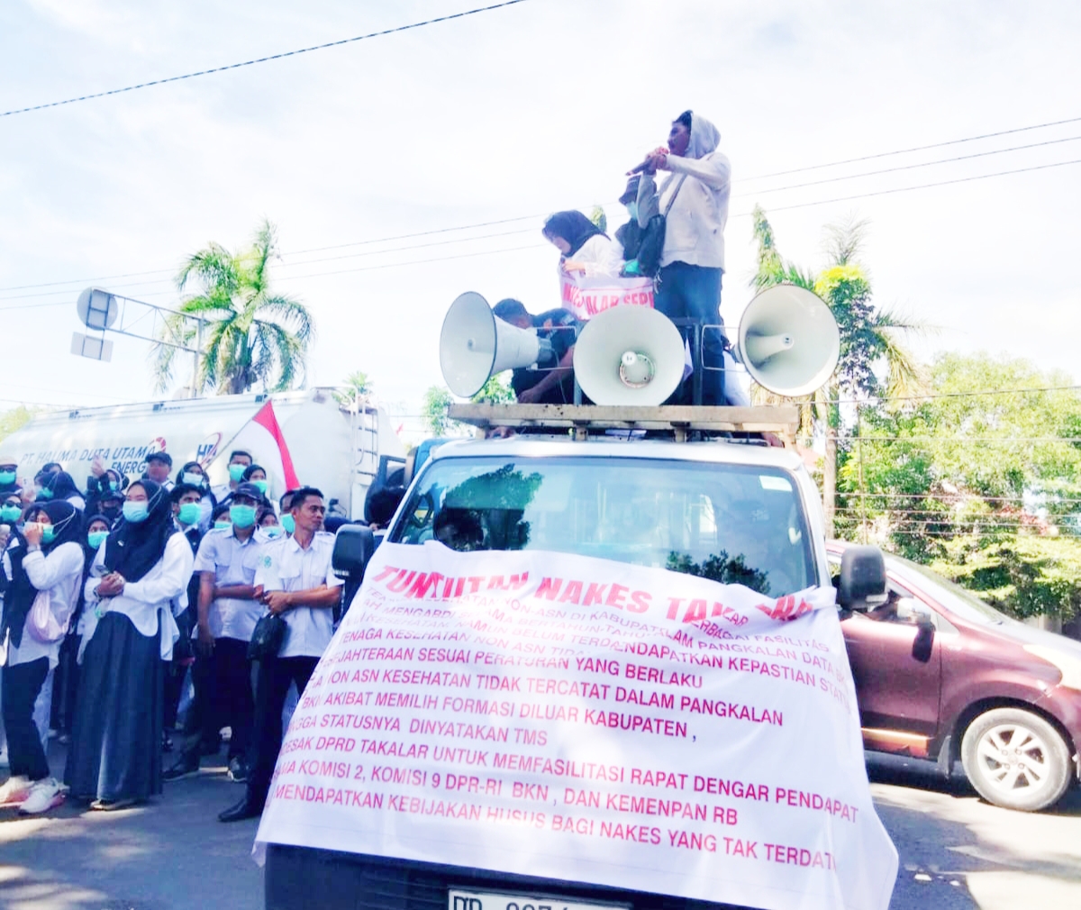 “Selama ini kami bekerja penuh waktu untuk melayani masyarakat, namun status kami seolah tak diakui oleh negara,” ujar salah seorang perwakilan nakes dalam orasinya.