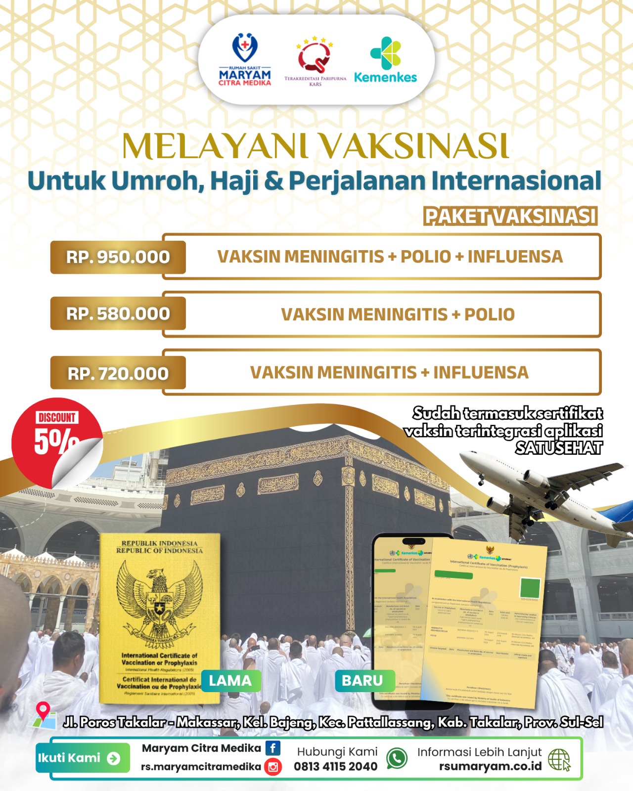 RS Maryam Citra Medika Takalar memberikan diskon 5% untuk paket vaksinasi khusus bagi jamaah umroh dan haji. Lebih menarik lagi, sertifikat vaksinasi yang Anda dapatkan sudah terhubung langsung dengan aplikasi SatuSehat, memudahkan Anda dalam proses verifikasi dan validasi di berbagai negara tujuan.