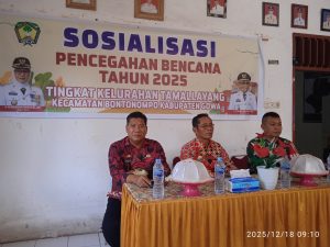 GARDATIMURNEWS.COM || GOWA-Pelaksanaan Sosialisasi Pencegahan Bencana Tingkat Kelurahan Tamallayang Kecamatan Bontonompo,Kamis (18/12/2025) dibuka secara langsung oleh Camat Bontonompo, H Muh Syahrir Salam, S.Ag.,MM. Dalam sambutannya Camat Bontonompo menghimbau kepada lapisan Masyarakat Kelurahan Tamallayang pada Khususnya sebagai Ibu Kota Kecamatan dan Umumnya kepada Masyarakat Kecamatan Bontonompo agar dapat senantiasa memperhatikan adanya tumpukan sampah yang berdampak menyumbat saluran air dan dapat mengakibatkan banjir, termasuk perhatian kepada lapisan masyarakat yang memiliki pohon terlalu rindang dan lebat supaya segera di pangkas untuk menghindari rubuhnya pohon tersebut karena dampak angin kencang dalam musim hujan seperti saat ini.